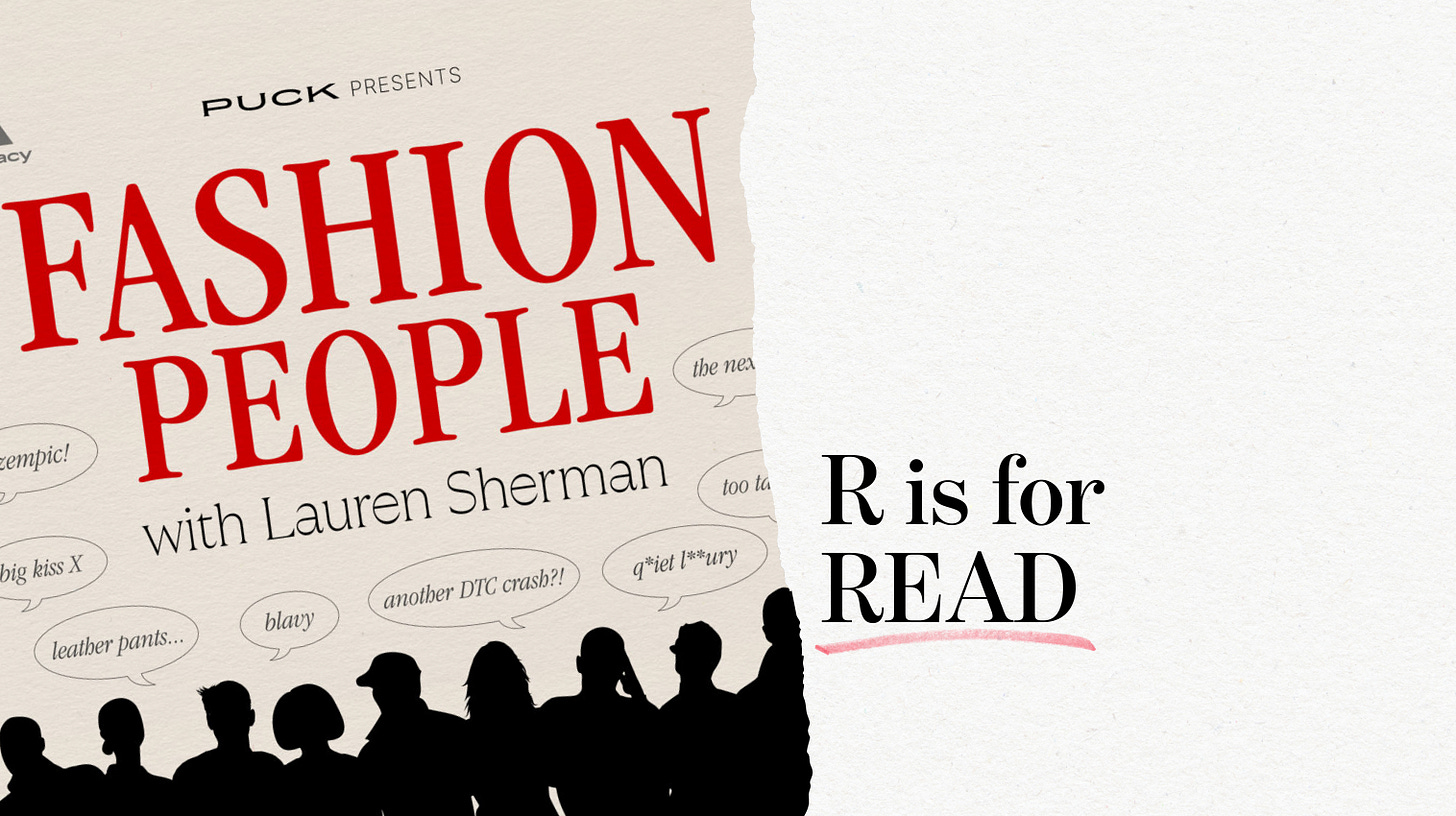 Michelle: In our first list, I mentioned Air Mail and the Morning Meeting podcast, which was always a favorite Saturday listen. Sadly, Morning Meeting is no longer being produced, but one of its voices, Ashley Baker, now writes a Substack called Out of My Element, a mix of cultural observations, rants and raves, and dispatches from a longtime New Yorker living in London. I also continue to rely on Puck, particularly The Line Sheet, the fashion and beauty vertical written by Lauren Sherman, Rachel Strugatz, Sarah Shapiro, and, most recently, Malique Morris, who consistently bring a sharp perspective to the business side of the industry. And when I want the audio version of that world, the Fashion People podcast has become a favorite morning listen, a quick, informed way to catch up on the latest conversations shaping the industry.